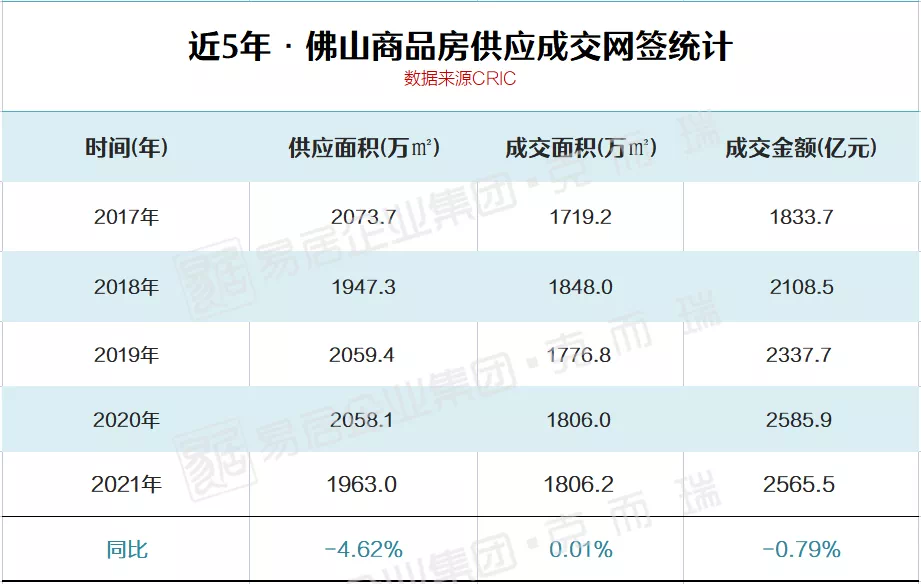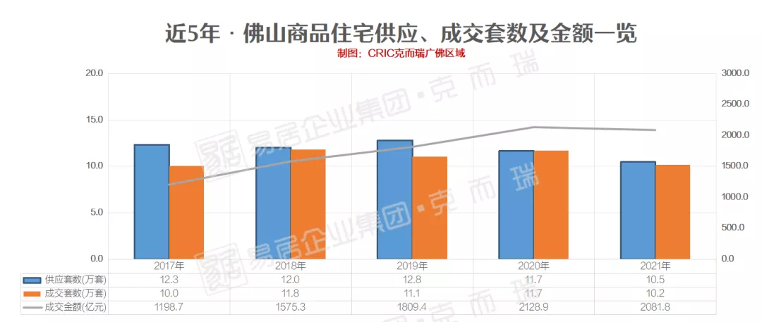 据统计,2021年佛山商品住宅供应10.5万套,同比减少10.2%,成交10.2万套,同比减少12.9%,全年住宅成交2081.8亿元,同比下降2.2%。