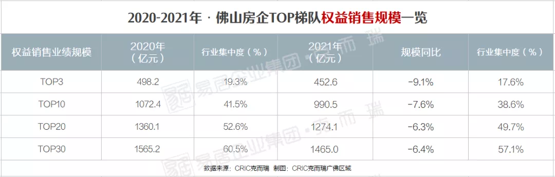 值得一提的是,2021年佛山房企销售规模遭遇缩减,行业集中度均跌!