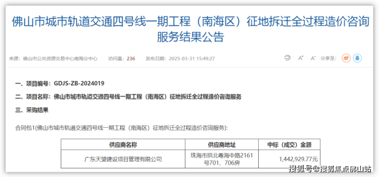 确定广东天望建设项目管理有限公司为中标商,提供佛山市城市轨道交通四号线一期工程(南海区)征地拆迁全过程造价咨询服务,代理服务费金额1442929.77元。