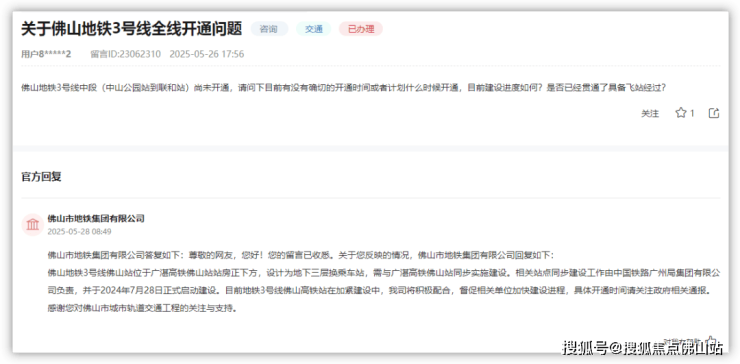 另一边,大家关注的佛3全线贯通问题,小狐发现政府留言板出现不少市民咨询。