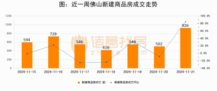 根据佛山市住房保障和房产信息网数据显示,2024年11月21日佛山新建商品房成交926套,较昨日增加424套,环比上涨84.5%