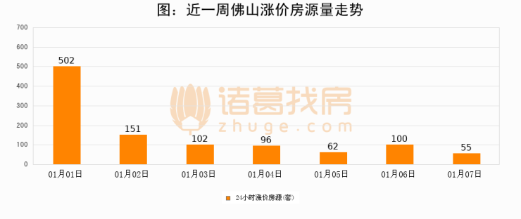 根据诸葛找房数据显示,佛山24小时涨价房源量为55套,较01月06日减少45套,环比下降45%。与此同时,涨价房源占比小幅回落,对于购房者来说是一个入市窗口期,购房者可抓住时机入市。