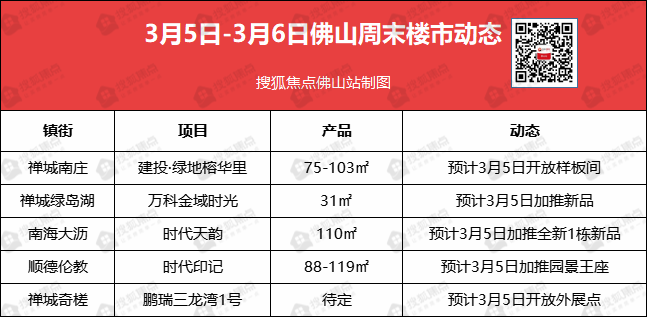 据小狐不完全统计,佛山楼市本周末(3月5-6日),至少有5盘有营销节点,以加推为主。