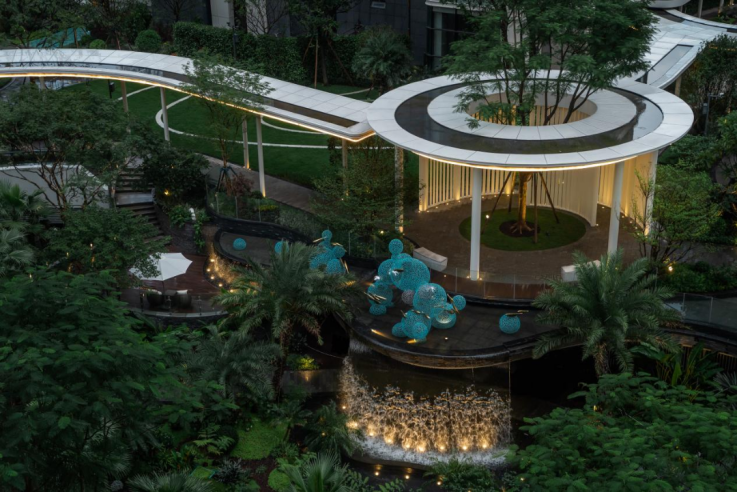 从泳池花园,到社区的每个角落细节,曲线与曲线间衔连相接,无论是从空中鸟瞰,还是在园中游走,都能感受到方圆曲直所共构而成的多维视觉体验。