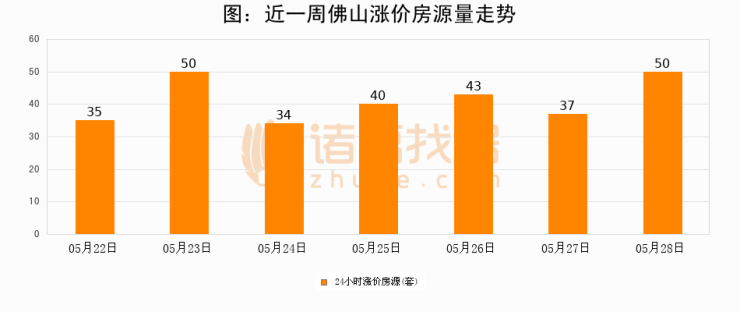 根据诸葛找房数据显示,佛山24小时涨价房源量为50套,较05月27日增加13套,环比上涨35.1%。与此同时,涨价房源占比小幅扩大,业主信心有所提升。