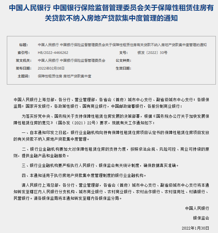 2月8日,从中国人民银行获悉,中国人民银行、中国银行保险监督管理委员会发布保障性租赁住房有关贷款不纳入房地产贷款集中度管理的通知。自本通知印发之日起,银行业金融机构向持有保障性租赁住房项目认定书的保障性租赁住房项目发放的有关贷款不纳入房地产贷款集中度管理。