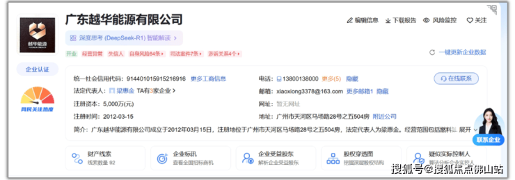 爱企查显示,佛山市天富房地产有限公司于2012年成立,背后大股东为广东越华能源有限公司。