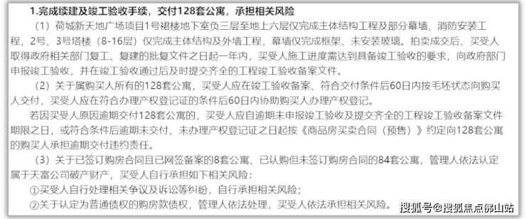 此外,荷城新天地广场项目已停工多年,天富公司进入破产程序后管理人并未接管到全部工程材料。因此,买受人需自行核实项目取得土地、立项、规划、设计、报建、施工、预售等情况,承担相应一切风险及费用。