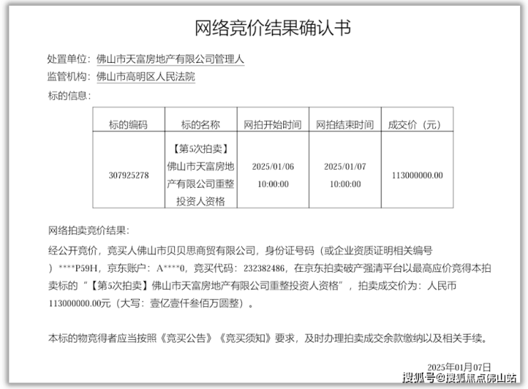 令人感到诧异的是,早在今年1月,佛山市贝贝思商贸有限公司就以1.13亿元拍下过该房企的重整投资人资格,所拍标的物相同。