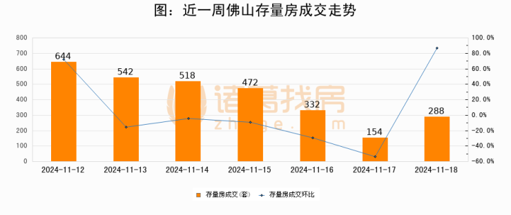 从存量房来看,2024年11月18日佛山存量房单日成交288套,比昨日增加134套,环比上涨87%。从近一周存量房成交来看,佛山存量房日均成交套数为421套,11月18日单日成交288套,低于近一周平均水平31.6%。
