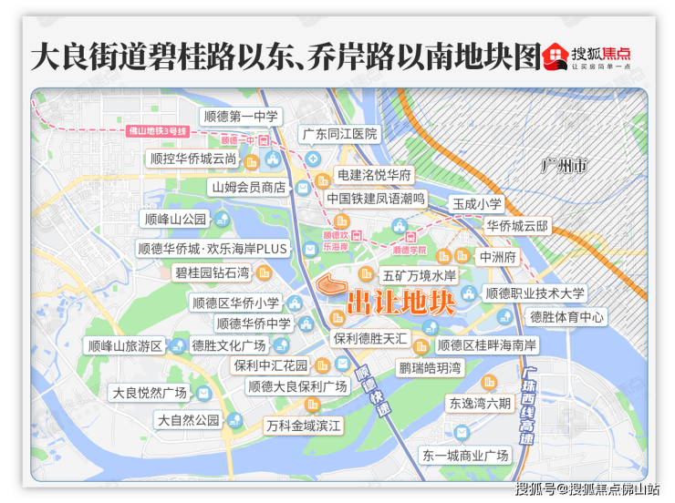该地块紧邻顺德欢乐海岸PLUS,南临桂畔海,周边有顺德山姆、顺峰山公园、五矿万境水岸、华侨城天鹅堡二期等。