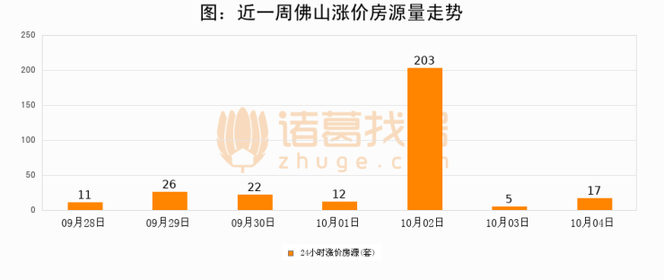 根据诸葛找房数据显示,佛山24小时涨价房源量为17套,较10月03日增加12套,环比上涨240%。与此同时,涨价房源占比小幅扩大,业主信心有所提升。