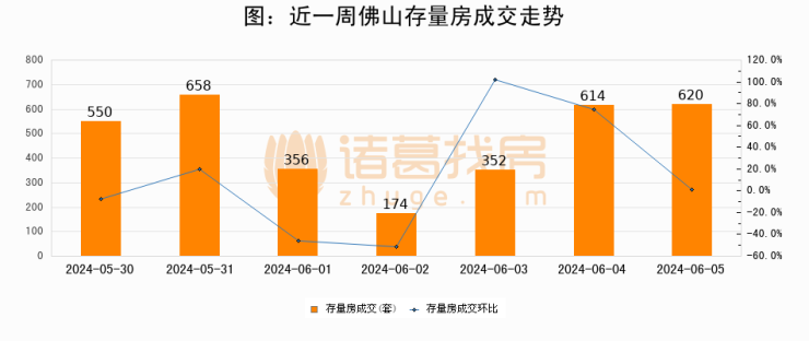 从存量房来看,2024年06月05日佛山存量房单日成交620套,比昨日增加6套,环比上涨1%。从近一周存量房成交来看,佛山存量房日均成交套数为474套,06月05日单日成交620套,高于近一周平均水平30.8%。