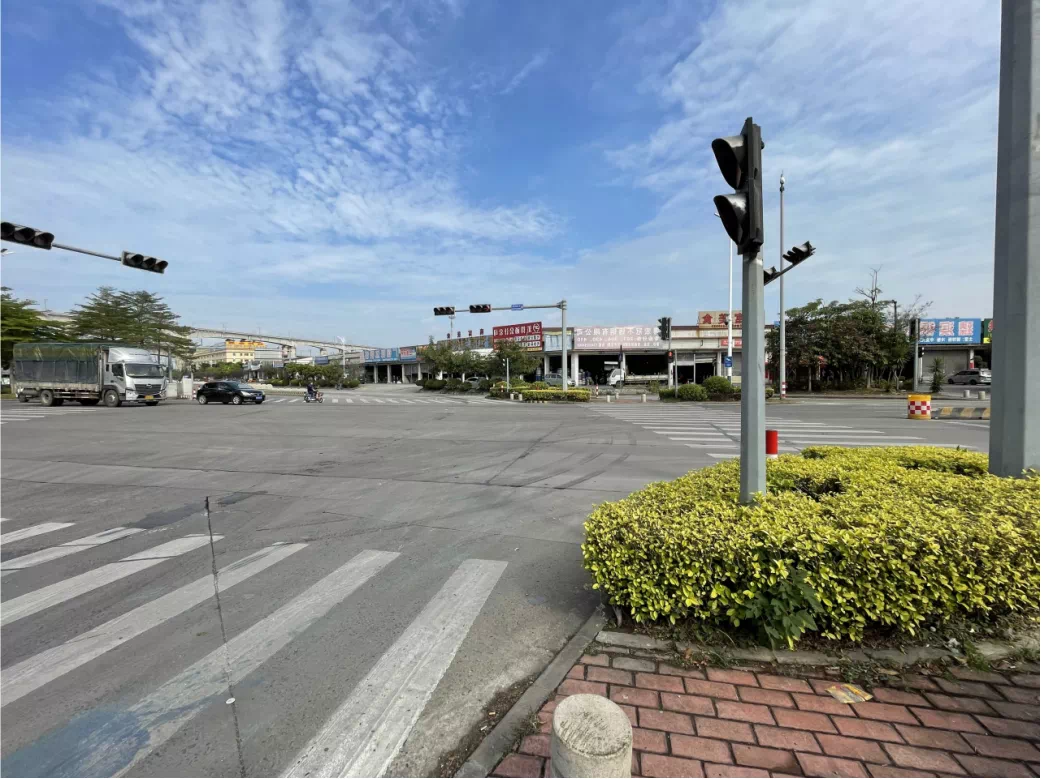 荷富路中央分隔两侧设有轨电车(均为地面线路),共有10座站台(荷富路与明湖南路路口等7座站台对应路口设置交通信号灯供行人过街换乘);荷富路与明湖南路路口过街长度较长约50米,按规范设置了二次过街人行信号灯,原信号机运行方案设三个相位,分别是①荷富路南北同时直行、②荷富路南北同时左转、③明湖南路东西同步放行,其中横过明湖南路约23米,行人过街跟随相位①,时间充足;南出口和北出口行人横过荷富路跟随相位②,设置了30-38秒;南进口和北进口行人横过荷富路跟随相位③,对应设置了28至38秒。