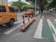 市民反映的塑料桶为防撞警示桶,是消耗保护措施,起到警示作用,目的是防止机动车刮蹭中间的路基,同时在摩托车电动车撞击时起到缓冲作用,能一定程度保护驾乘人员,现场放置位置合理。下一步交警、交通部门继续完善、翻新丹横路往横江路标线。