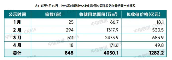 各地公示拟使用专项债收购存量闲置土地的增量正在提速。根据中指研究院不完全统计,今年1-2月各地公示拟使用专项债收购存量闲置土地数量合计319宗,总金额接近550亿元。相比之下,3月以来,各地公示的节奏明显加快,总共公示地块511宗,较2月增加217宗,总金额约684亿元,环比增长29%。整体来看,截至4月10日,全国各地公示拟使用专项债收购存量闲置土地的数量约850宗,总面积超4000万平方米,总金额达1282亿元。