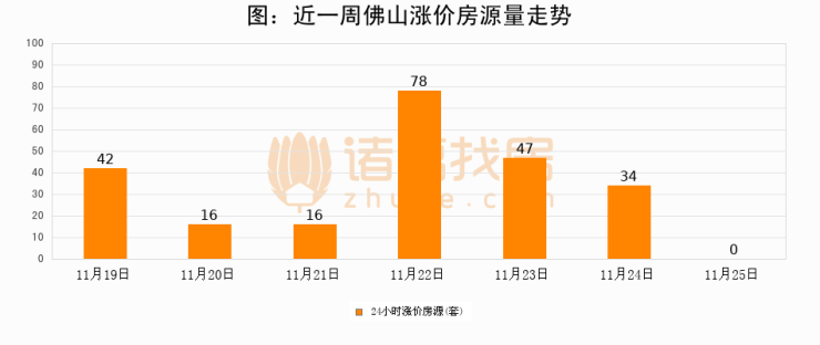 根据诸葛找房数据显示,佛山24小时涨价房源量为0套,较11月24日减少34套,环比下降100%。与此同时,涨价房源占比小幅回落,对于购房者来说是一个入市窗口期,购房者可抓住时机入市。