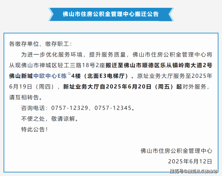 6月12日,佛山市住房公积金管理中心发布搬迁公告: