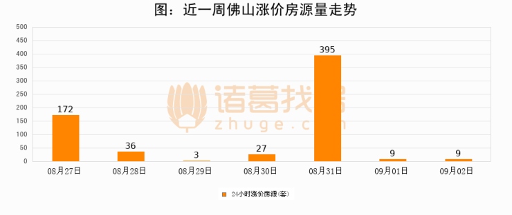根据诸葛找房数据显示,佛山24小时涨价房源量为9套,较09月01日持平。