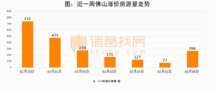 根据诸葛找房数据显示,佛山24小时涨价房源量为266套,较03月05日增加189套,环比上涨245.5%。与此同时,涨价房源占比小幅扩大,业主信心有所提升。