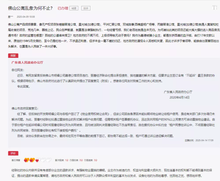 近日,从领导留言板上可以看到多名网友投诉佛山多个无产权项目。