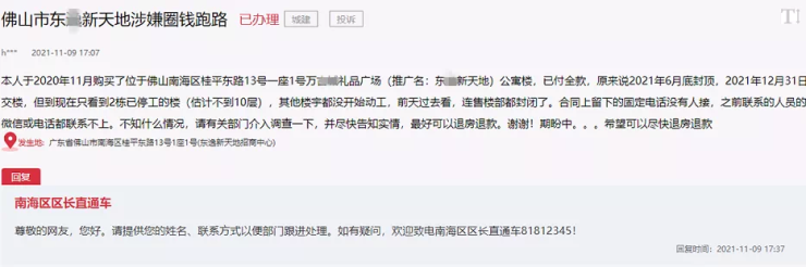 高明兆x广场投诉截图,来源:佛山市领导留言板