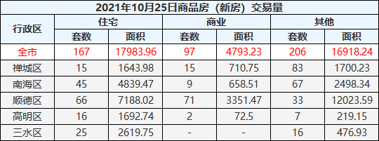 10月25日,佛山一手住宅成交167套,成交面积17983.96㎡