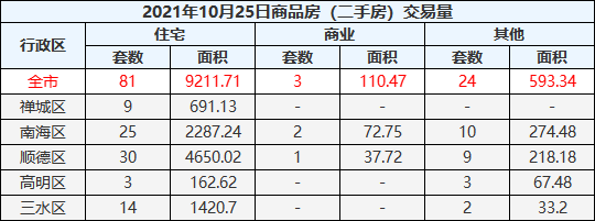二手住宅成交81套,成交面积9211.71㎡,其中禅城9套,南海25套,顺德区30套,高明区3套,三水区14套。