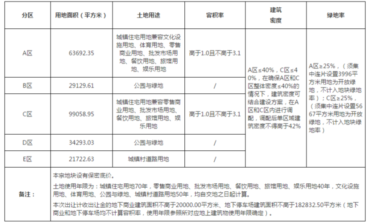 其中,A区和C区为住宅兼容商业用地,容积率不高于3.1,建筑密度不高于40%,绿地率不低于25%,建筑限高140米,须于1年内动工,4年内竣工。