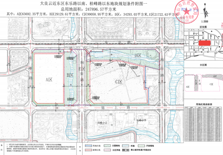 根据出让文件显示,宗地总占地面积247896.57㎡,分为五区分别开发:A区占地面积63692.35㎡,B区占地29129.61㎡,C区占地99058.95㎡,D区占地34293.03㎡,E区占地21722.63㎡。