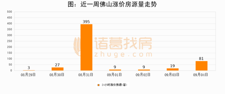 根据诸葛找房数据显示,佛山24小时涨价房源量为81套,较09月03日增加62套,环比上涨326.3%。与此同时,涨价房源占比小幅扩大,业主信心有所提升。