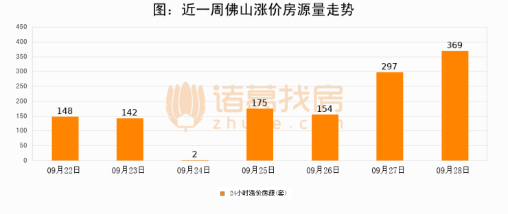 根据诸葛找房数据显示,佛山24小时涨价房源量为369套,较09月27日增加72套,环比上涨24.2%。与此同时,涨价房源占比小幅扩大,业主信心有所提升。
