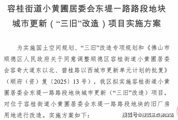 近日,佛山市顺德区人民政府发布《关于同意容桂街道小黄圃居委会东堤一路路段地块城市更新(“三旧”改造)项目实施方案的批复》。