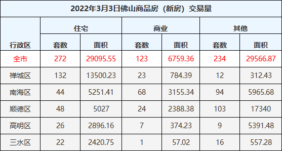 3月3日,佛山一手住宅成交272套,成交面积29095.55㎡