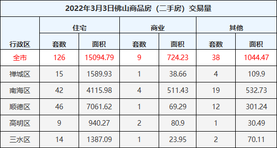 二手住宅成交126套,成交面积15094.79㎡,禅城15套,南海区42套,顺德区46套,高明区9套,三水区14套。