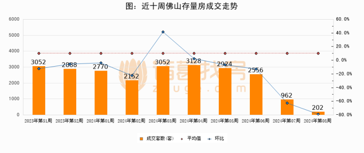 存量房方面,第07周佛山存量房成交202套,较上周减少760套,环比下降79%。从近十周成交走势来看,周均成交套数为2368套,本周低于平均水平91.5%。