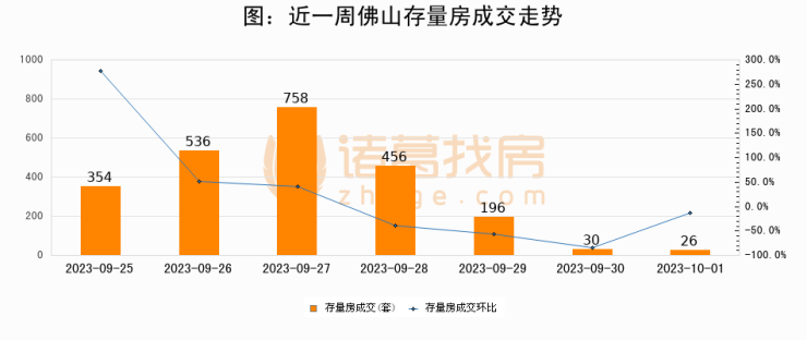 从存量房来看,2023年10月01日佛山存量房单日成交26套,比昨日减少4套,环比下降13.3%。从近一周存量房成交来看,佛山存量房日均成交套数为336套,10月01日单日成交26套,低于近一周平均水平92.3%。