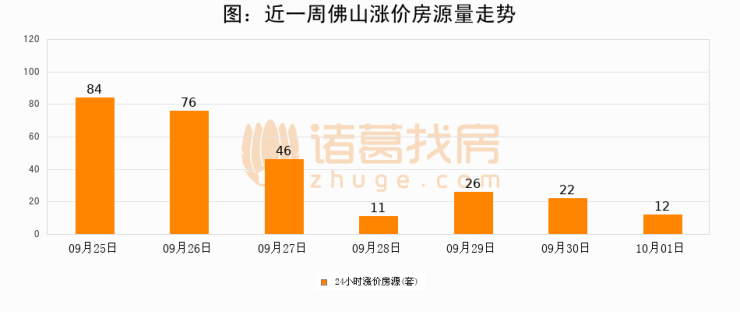 根据诸葛找房数据显示,佛山24小时涨价房源量为12套,较09月30日减少10套,环比下降45.5%。与此同时,涨价房源占比小幅回落,对于购房者来说是一个入市窗口期,购房者可抓住时机入市。