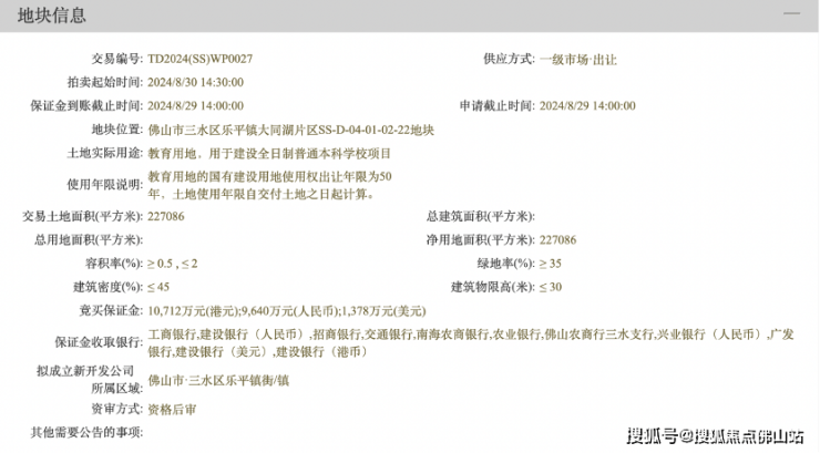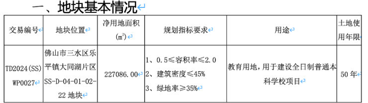宗地占地面积227086㎡,出让年限为50年,容积率≤2%,绿地率≥35%,建筑密度≤45,建筑高度≤30