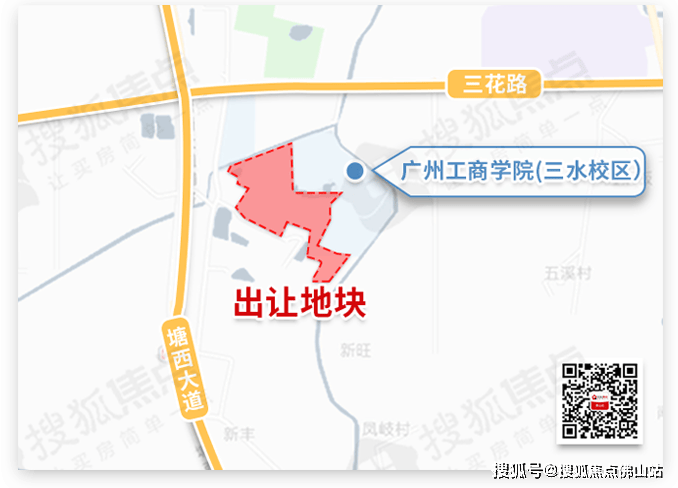 据出让地块的地图显示,与广州工商学院三水校区基本吻合。地块形状在原校区范围的基础上,纳入了此外还新增了一些工业厂房。
