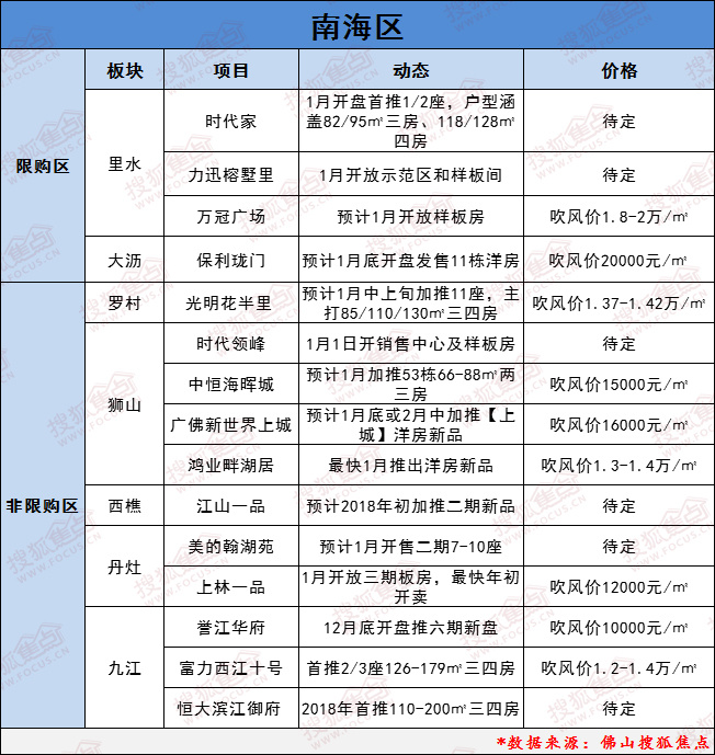 南海狮山、丹灶则属于非限购区域中的“推货主力”,位于狮山罗村的光明花半里,预计1月中上旬加推,吹风价约13700-14200元/㎡;美的翰湖苑则将于1月推售二期新品,涵盖89-160㎡三四房。