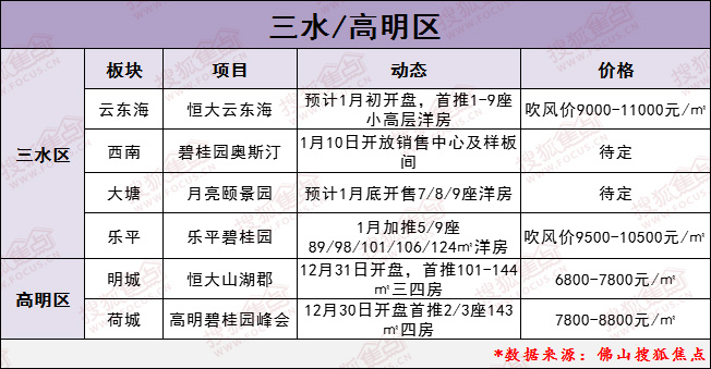已经吸引了大批房企进驻的三水区,新盘新货陆续有来。位于三水云东海的生态盘,恒大云东海预计1月初开盘,吹风价约9000-11000元/㎡;作为乐平板块排名前列破万的项目——乐平碧桂园同样在1月加推89-124㎡新品,吹风价约9500-10500元/㎡。