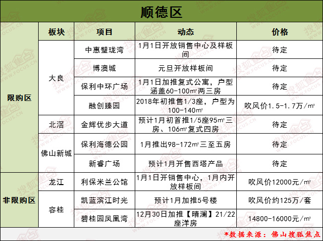 金辉首进北滘的项目—金辉优步大道预计1月初首推,主打130㎡产品;大良板块新货集中,纯新盘中惠璧珑湾已于1月1日开发销售中心和样板间,保利中央广场和融创臻园都预计在1月开卖。