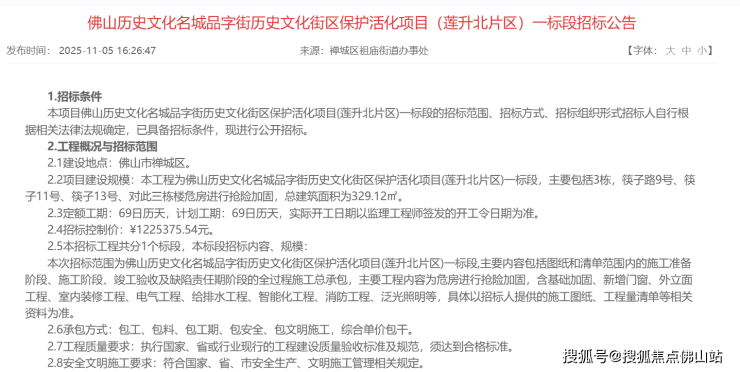 招标公告显示,本工程为佛山历史文化名城品字街历史文化街区保护活化项目(莲升北片区)一标段,主要包括3栋,筷子路9号、筷子11号、筷子13号、对此三栋楼危房进行抢险加固,总建筑面积为329.12㎡。计划工期69天,招标控制价为122,5375.54元。
