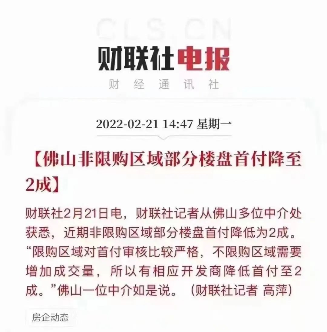 前不久,有中介方面消息透露:佛山部分非限购区楼盘的首付下调为2成!