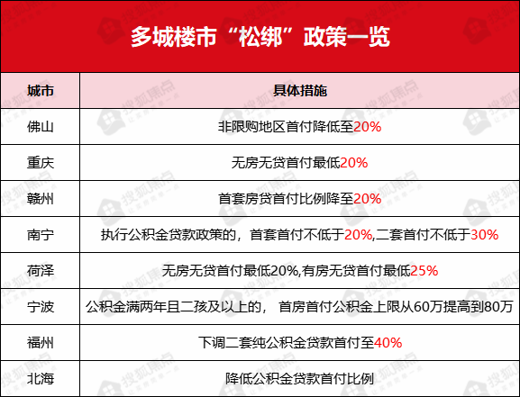 此外,除了佛山,我们还不难发现,近段时间以来,重庆、赣州、菏泽等全国多地都陆续公布了“下调贷款利率,降低购房首付”的双重组合拳政策。