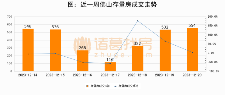 从存量房来看,2023年12月20日佛山存量房单日成交554套,比昨日增加22套,环比上涨4.1%。从近一周存量房成交来看,佛山存量房日均成交套数为410套,12月20日单日成交554套,高于近一周平均水平35.1%。