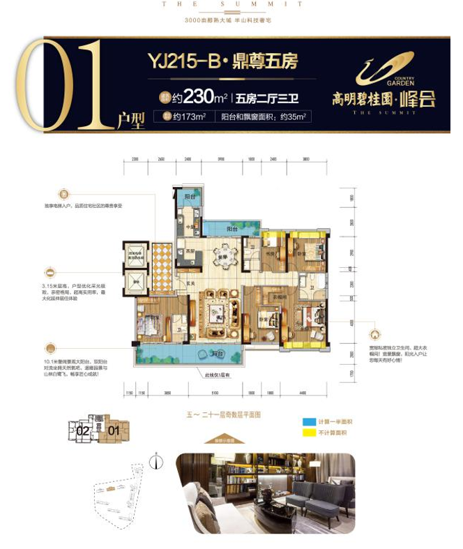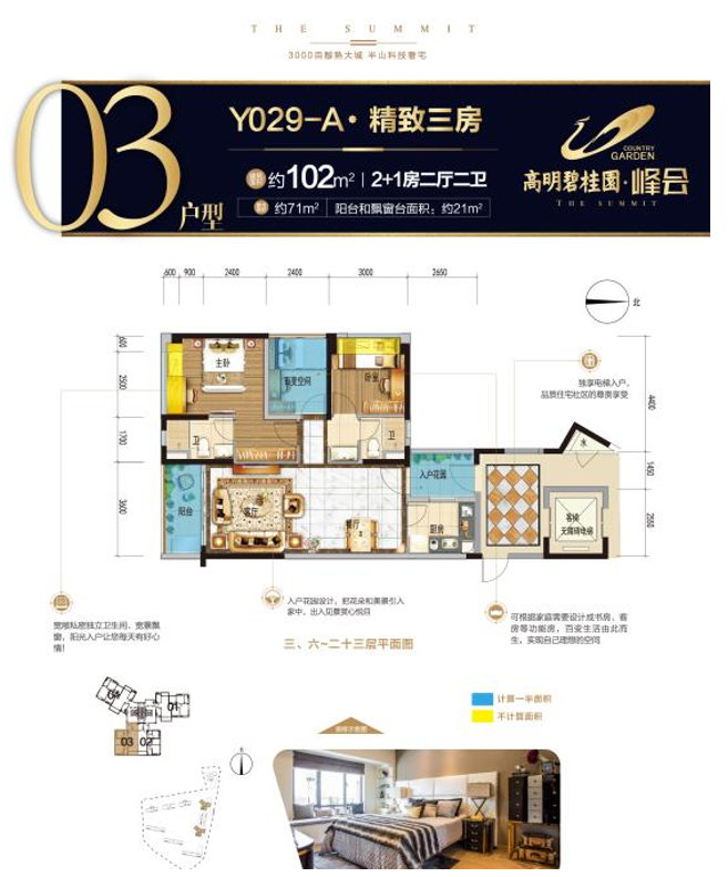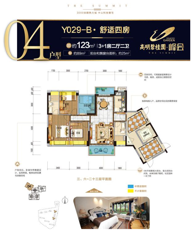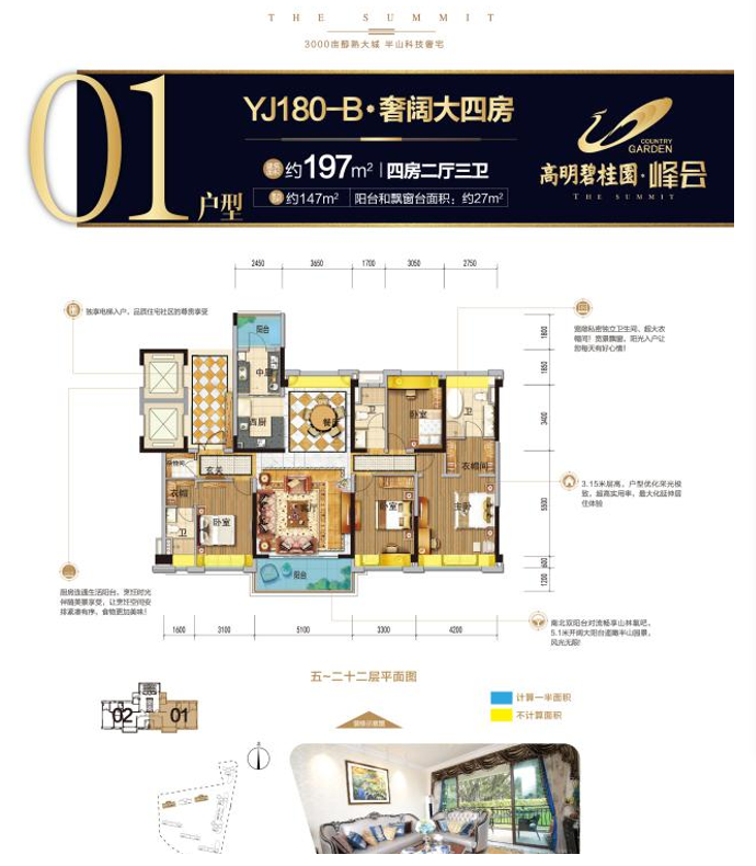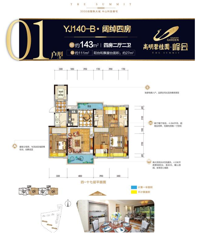 高明碧桂园峰会户型均可做到电梯入户!南北朝向,通风采光性能好,私密性强。主推的名门140户型(建面约143㎡),4.8米阔绰的南向大客厅,拥有开阔的景观视野,瞰山揽园。南北卧室,精致典雅的四房设计,奢适享受。