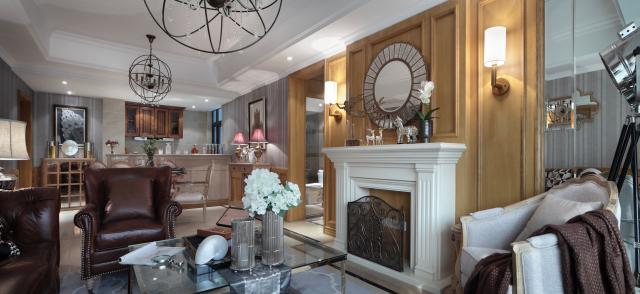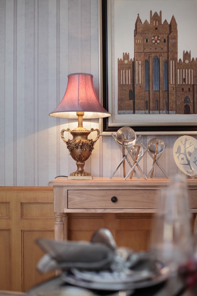 桌子上的装饰品,台灯、水晶球、陶瓷碟、艺术壁画,都非常精美,无不显露出业主非凡的生活品味。