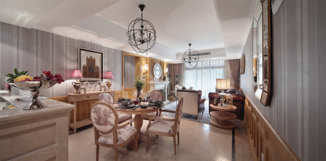 餐厅风格与客厅基本一致,不管是餐桌、柜子、墙边都延用木元素为主,色彩明亮高雅。而餐椅为软包式,配上图案更有欧式韵味,用餐时坐着更愉快舒服。